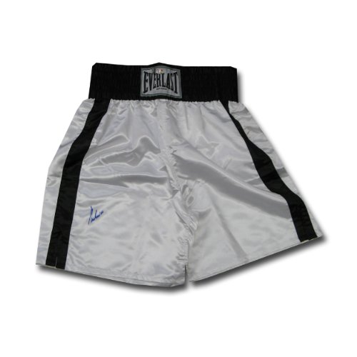Autographed Muhammad Ali black and white boxing trunks. Muhammad Ali (born Cassius Marcellus Clay Jr., January 17, 1942 in Louisville, Kentucky, U.S.) is a retired American boxer and three-time World Heavyweight Champion, who is widely considered to be one of the best heavyweight boxing champions ever. As an amateur, he won a gold medal in the light heavyweight division at the 1960 Summer Olympics in Rome. As a professional, he became the first person to win the lineal heavyweight championship three times.Each items comes with a Muhammad Ali enterprises new digital hologram and PSA letter-COA Muhammad Ali Enterprises matching serialized #'s COA will say Muhammad Ali AutographProfessional Sports Authenticator (PSA), the world's largest authentication and certification service for sports collectibles, has teamed up with DNA Technologies, Inc. to strike a blow against the piracy and counterfeiting of autographs and other collectibles. PSA/DNA tags each item using state-of-the-art technology to protect your collectibles. Besides the tamper-evident label, serial number, and certificate, PSA/DNA's multi-level security system uses a DNA matrix. PSA/DNA eliminates the problem of counterfeits and forgeries by labeling items in such a way that they can be sold time after time without fear of fraud. Each new buyer can be confident that he or she is spending money on an authentic item.