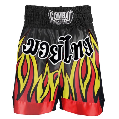 Combat Sports International combined the best features of the classic design with innovative technologies to create Muay Thai shorts with superior function and increased style. Features include: Flexible Spring Stretch Panels in both the inseam and on the sides for greater mobility, eliminating any hinderance when throwing kicks and knees Fully sublimated artwork that offers options and styles unattainable with sewn-on patches and embroidery Red and yellow Flames with Thai-Kadai design on front and back of durable black satin fabric that offers lasting light-weight comfort and softness